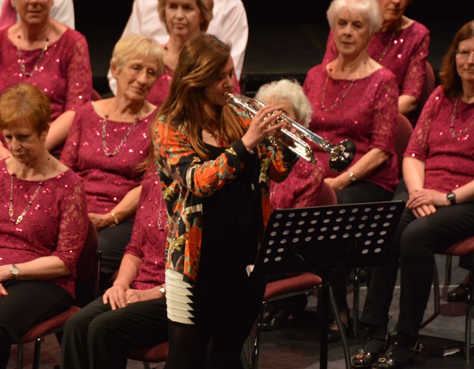 A New Music Makers’ night out is not only about the choir, as we support talented young musicians by involving them in our concerts.  This year, Rory Staff joined us on saxaphone and clarinet. Rory belongs to the Southampton Youth Jazz Orchestra and has played with the jazz saxophonists John Surman and John Toussaint, the jazz pianist Joseph and the award winning singer Leanne Carrol, so we knew we were in for a treat with his jazz set.  We were also joined by the multi talented Bethany Mayers. Bethany is a member of the Hampshire County Orchestra and the National Youth Chamber Orchestra.  She has recently returned from a music tour in Switzerland and from playing at the Royal College of Music.  Her chosen pieces were Chopin’s Waltz in B minor, Op 69, No 2, on the piano and Fool Contrast, on the trumpet, by Tony Cliff.   After completing her music studies at Peter Symmonds College, Bethany hopes to pursue her music studies at one of the UK’s top music conservatoires.